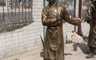 玻璃鋼仿銅人物店小二雕塑,古代迎賓人物雕塑